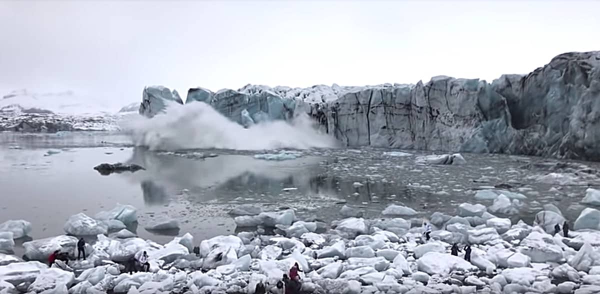 Tourists standing at the edge of a lagoon at the Breiðamerkurjökull glacier in Iceland ran for safety on Sunday after a massive wall of ice calved and sent a wave to the opposite shore. Nobody was hurt by the natural event.
