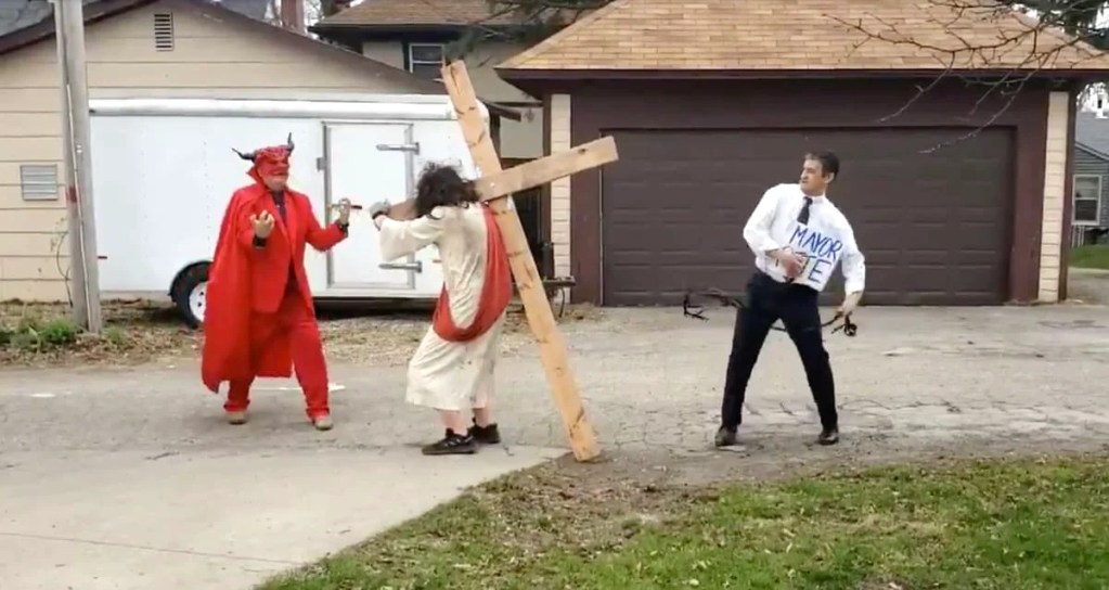 A man dressed as Buttigieg in a white shirt whipped a man dressed as Jesus on the cross while another protester dressed as a devil yelled “Yeah, beat your savior, beat him. Yeah, I hate this guy. Yes, more blood, Peter. Every vote is a lash on the back of Christ.”