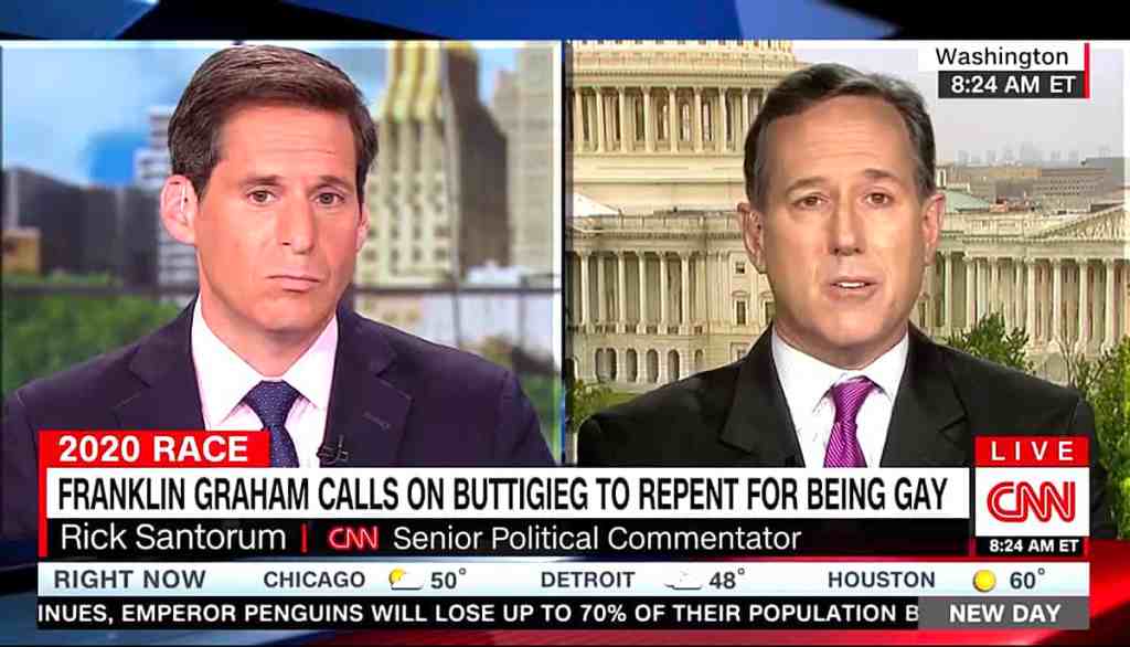 Rick Santorum stammered through a grilling from CNN's John Berman on New Day Friday over evangelist Franklin Graham's calls for Mayor Pete Buttigieg to repent for being gay.