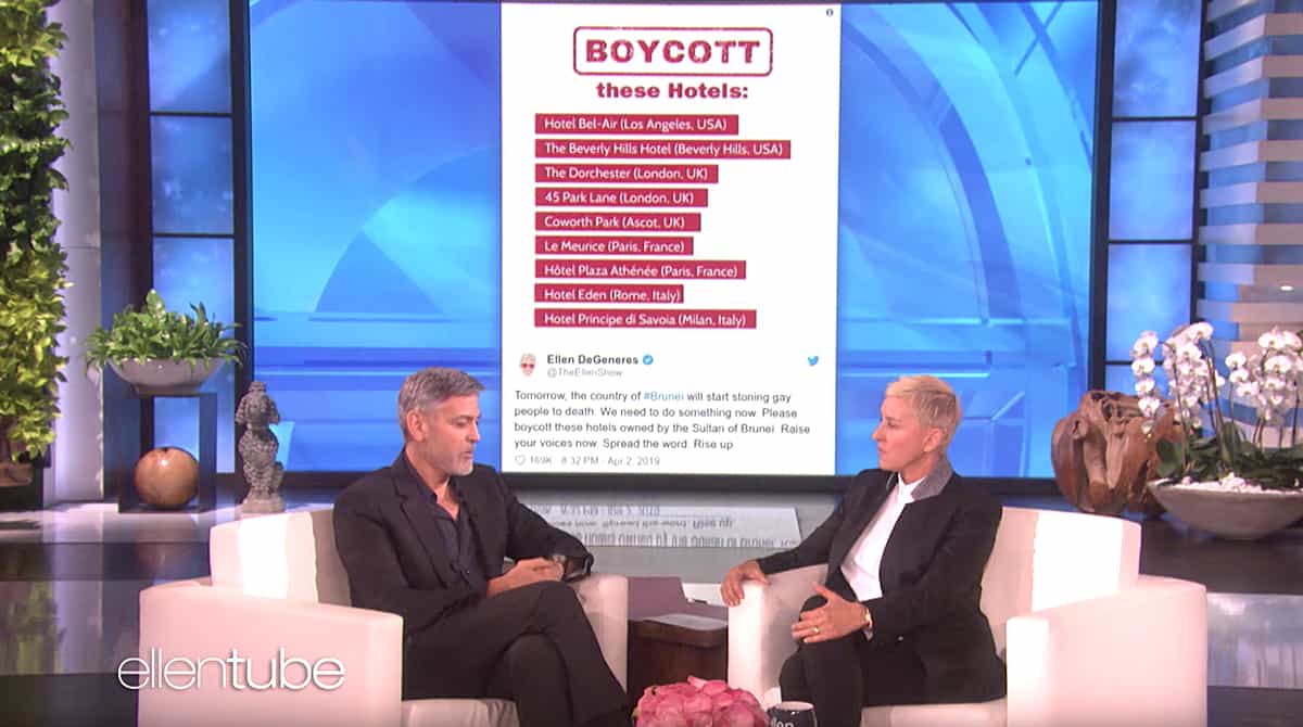 George Clooney spoke with Ellen DeGeneres about his call for a boycott on the Dorchester Hotel group and other businesses that do business with Brunei, which recently backtracked on a death by stoning penalty for gay sex.