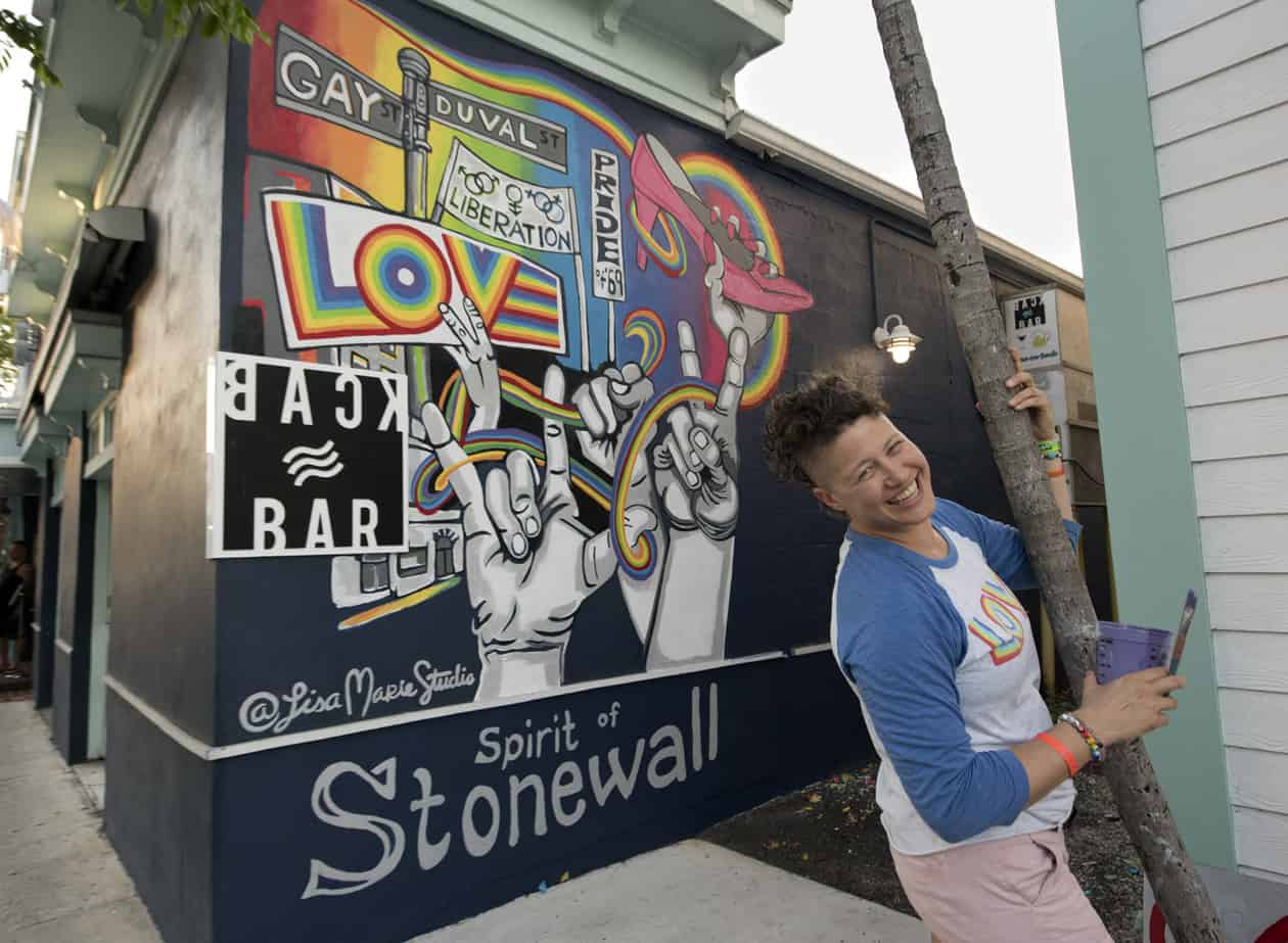 SPIRIT OF STONEWALL. Artist Lisa Marie Thalhammer's mural commemorates the 50th anniversary of the Stonewall riots outside Aqua Bar and Nightclub in Key West, Florida. The mural was created for the city's Pride celebrations which run through June 9. Photo: Rob O'Neal/Florida Keys News Bureau.