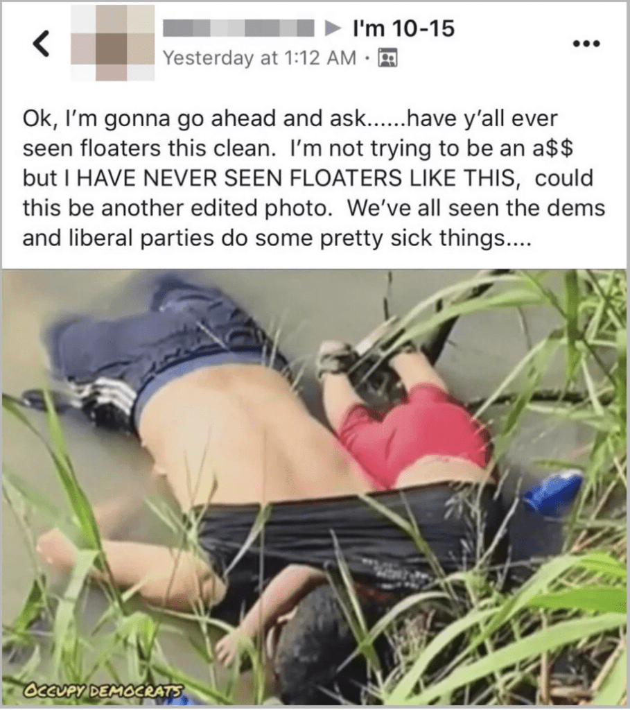 In another thread, a group member posted a photo of father and his 23-month-old daughter lying face down in the Rio Grande. The pair drowned while trying to ford the river and cross into the U.S.; pictures of the two have circulated widely online in recent days, generating an outcry.