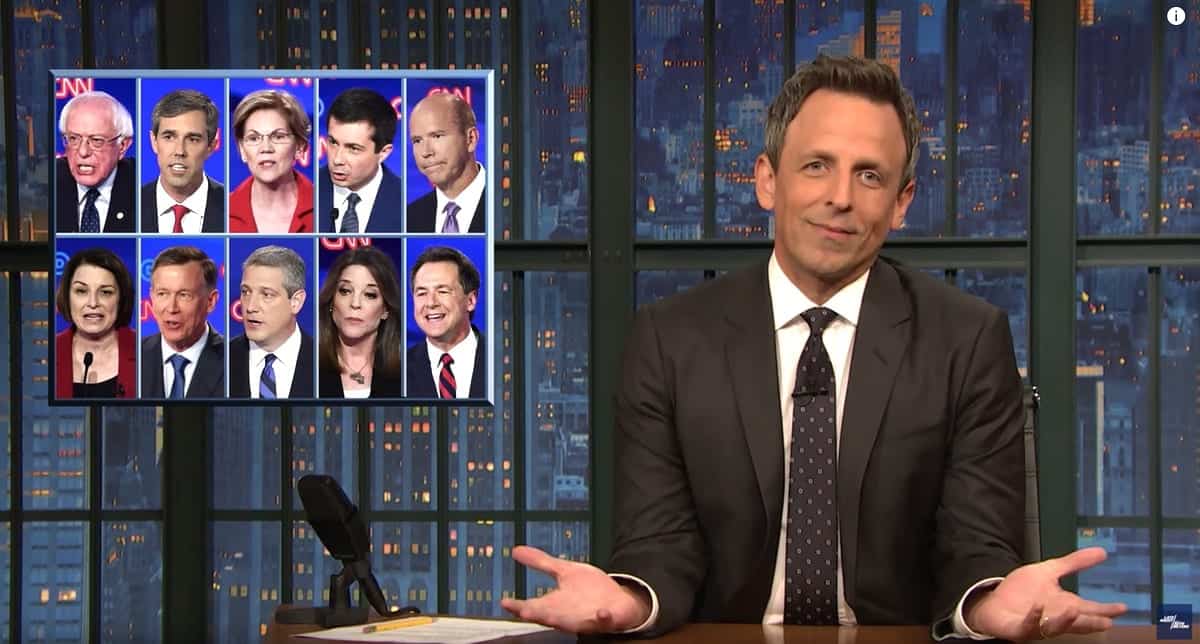 Meyers then moved on to the debate, and the tag team of Bernie Sanders and Elizabeth Warren, and the “big questions” ahead of the debate: “Like who the hell are these guys? (shows clip of John Hickenlooper, John Delaney, and Steve Bullock); would Beto bust out his Spanish again?; would Tim Ryan get caught touring the debate stage again (with backward baseball cap) looking like a pledge from Sigma Chi?; and would Marianne Williamson explode into a thousand butterflies that spell out the word ‘love'?”