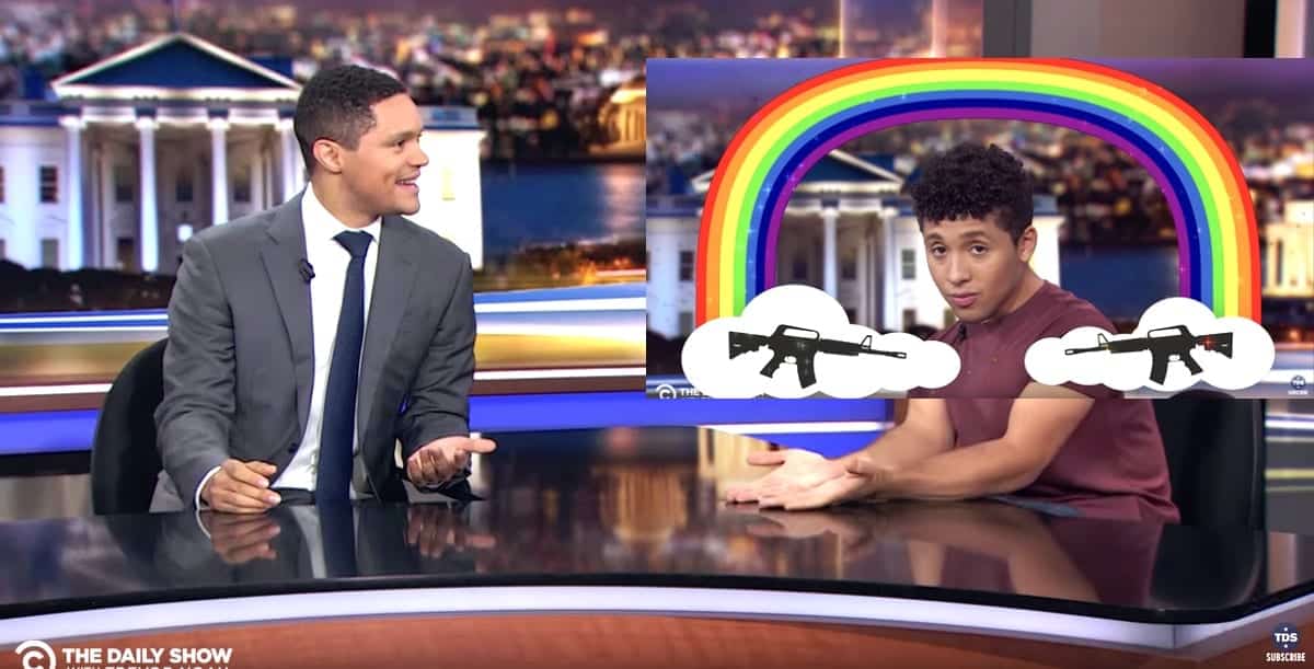 “Easy,” he explained to Trevor Noah. “We just need to make guns … gay.”