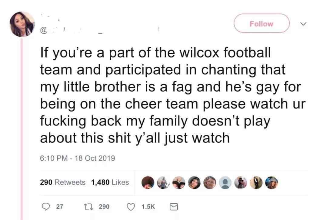 It says: “At a football game on October 18th, members of the Wilcox High School Varsity football team chanted homophobic slurs (including “f-g”) at a male member of the cheerleading team. They called him “gay” for cheerleading for THEIR team, and showing up every game to cheer them on. Despite the fact that the cheerleaders spend hours of their day cheering on various sports teams, these football members thought it appropriate to be cruel and harass a single cheerleader based on their biases and prejudice. While many people are aware of this incident, there is a slim chance much will be done to change this behavior by tweeting/posting about it. The main purpose of this petition is to call the administration and football coaches to attention, so they can investigate this incident. This sickening incident requires consequences, so it never happens to someone again. It would be greatly appreciated if you shared this.”