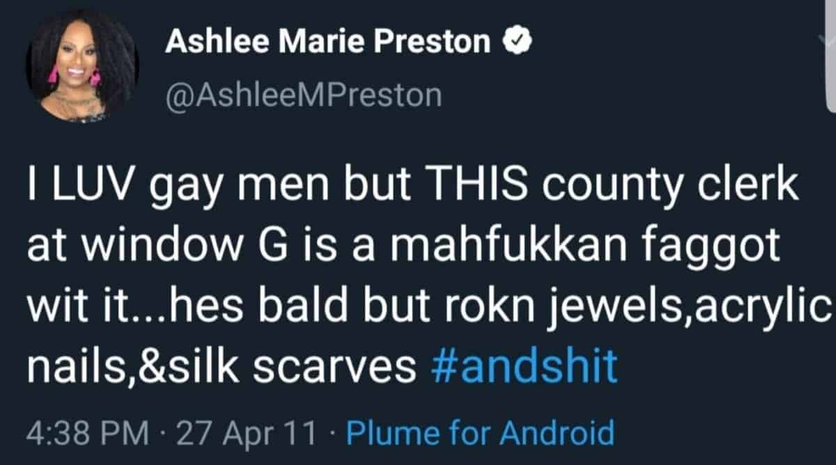 ASHLEE MARIE PRESTON. Elizabeth Warren trans campaign representative apologizes for racist and homophobic tweets. ‘Preston responded Monday on Twitter and Facebook with a statement that categorized the disclosures as “a political play,” but apologizes, blaming her then-addiction to methamphetamine. “I take full responsibility for my actions and deeply apologize to those I've offended or hurt. I also apologize to those indirectly impacted by these developments.” She says she has been clean and sober for over 7 ½ years and has learned “how to make amends when I'm wrong and to take complete accountability for my actions.”'