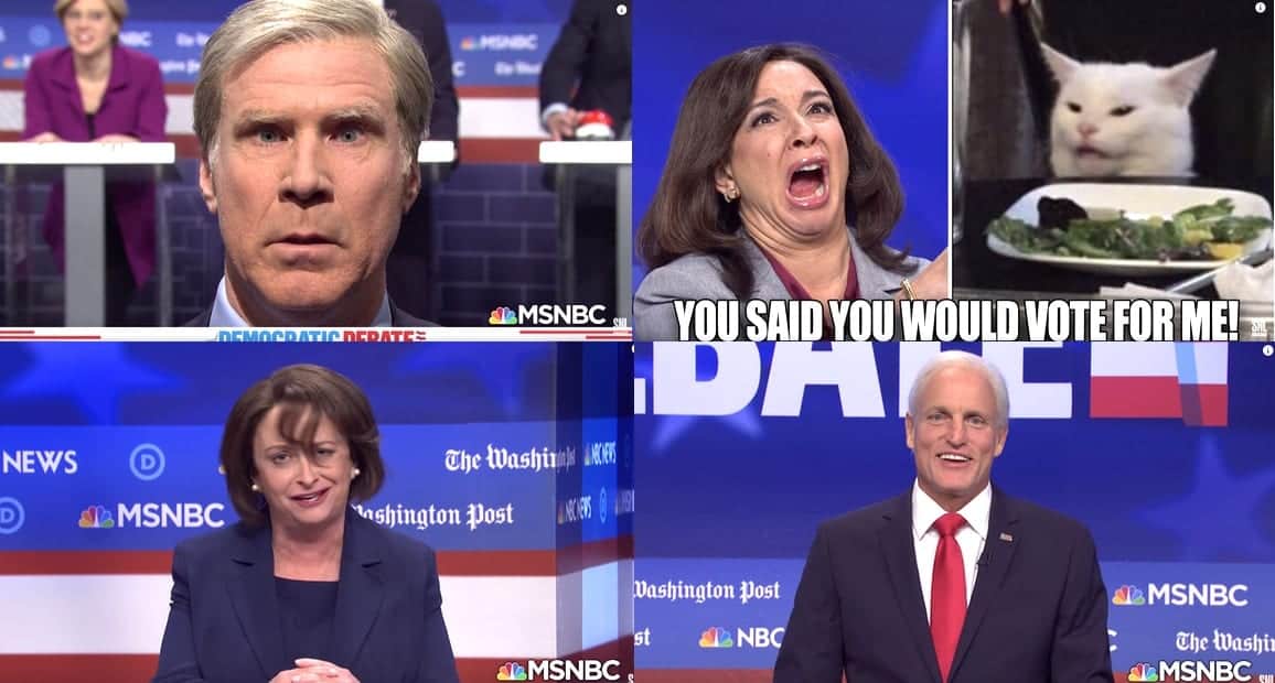 Kate McKinnon's Elizabeth Warren, Maya Rudolph's Kamala Harris, Colin Jost's Pete Buttigieg (wearing the suit from his first communion), Larry David's Bernie Sanders, Rachel Dratch's bang-shaking Amy Klobuchar, Woody Harrelson's Joe Biden, Chris Redd's Cory Booker, Bowen Yang's Andrew Yang (Bowen Yang), Cecily Strong's Tulsi Gabbard, Will Ferrell's Tom Steyer, and Fred Armisen's Michael Bloomberg hit the stage to try and snatch the attention of America's voters.