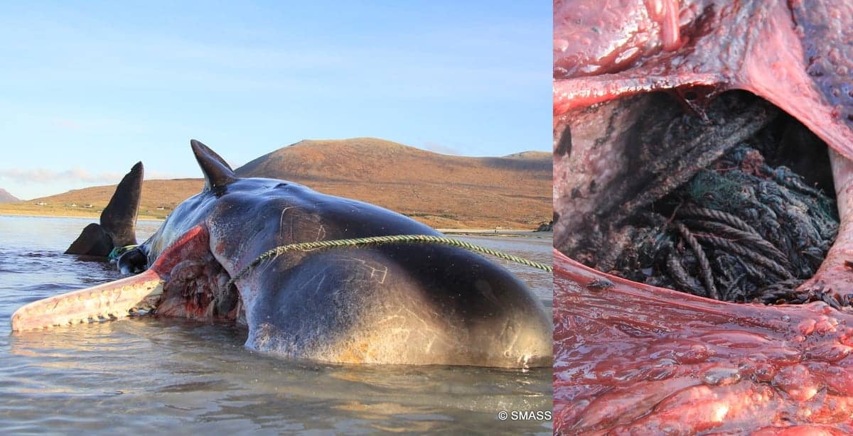 Wrote Scottish Marine Animal Strandings Scheme (SMASS) on Facebook: “In this whale's stomach was approximately 100kg of marine debris- a whole range of plastic including sections of net, bundles of rope, plastic cups, bags, gloves, packing straps and tubing. All this material was in a huge ball in the stomach and some of it it looked like it had been there for some time. The animal wasn't in particularly poor condition, and whilst it is certainly plausible that this amount of debris was a factor in its live stranding, we actually couldn't find evidence that this had impacted or obstructed the intestines. This amount of plastic in the stomach is nonetheless horrific, must have compromised digestion, and serves to demonstrate, yet again, the hazards that marine litter and lost or discarded fishing gear can cause to marine life. It is also perhaps a good example that this is a global issue caused by a whole host of human activities. This whale had debris in its stomach which seemed to have originated from both the land and fishing sectors, and could have been swallowed at any point between Norway and the Azores. We are looking in more detail to see if we can work out quite why this animal ended up with so much of it in its stomach.”