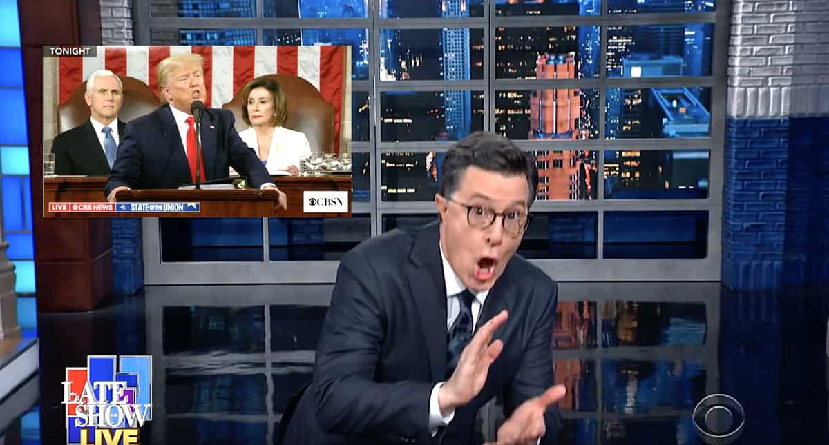 Said Colbert: “Before the speech even started, Trump threw shade: He wouldn't shake Nancy Pelosi's hand. You know what? Madam Speaker, next time don't offer him your hand, just offer him one finger.”