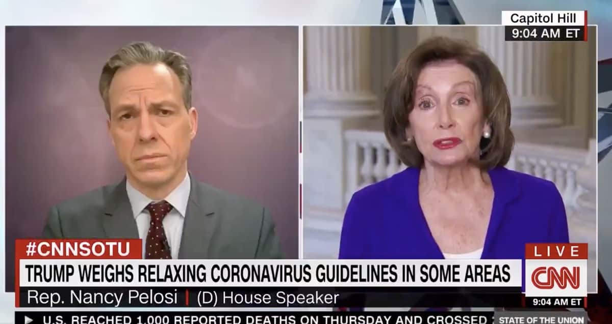 Said Pelosi: “First let me say how sad it is that ever since the president's signing of the [stimulus] bill, the number of deaths reported has doubled from 1,000 to 2,000 in our country. This is such a very, very sad time for us. So we should be taking every precaution. The president — his denial at the beginning was deadly. His delaying of getting equipment to where it — his continued delay in getting equipment to where it's needed is deadly. And now I think the best thing to do would be to prevent more loss of life.