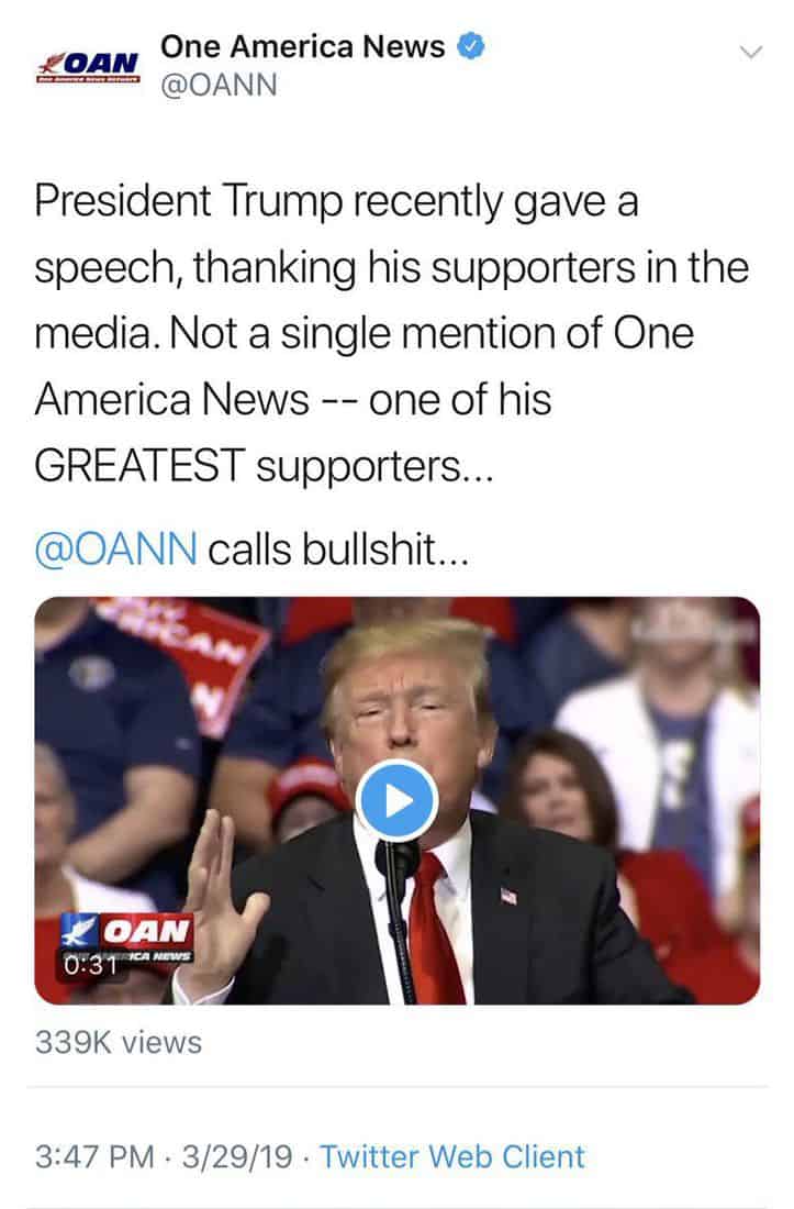 “The whole selling point for OAN is that they are Fox News with even less shame and even fewer scruples,” Oliver added. “In fact, they're so flagrantly smitten with Trump their network account actually tweeted” and later deleted this: