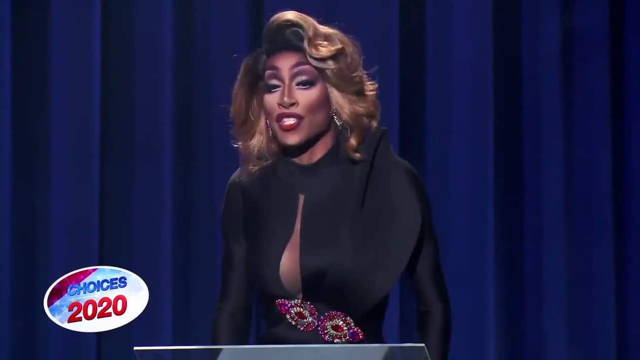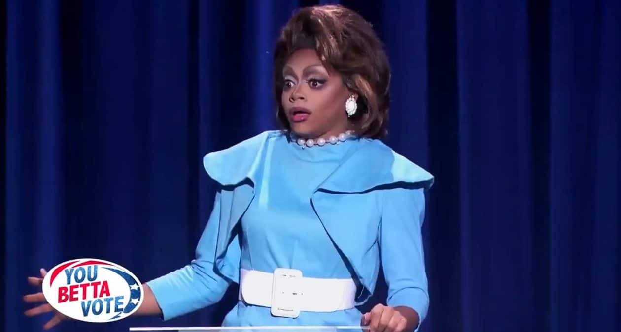 Still one note is one more note than any “joke” from Widow. The Lady Von Du du not understand the assignment. Instead of crafting a kooky character, she tries to play it straight. (Or as straight as a mock drag queen debate can be?) If ever there were a moment for Trinity the Tuck's “Where are the jokes?” GIF, it's now.