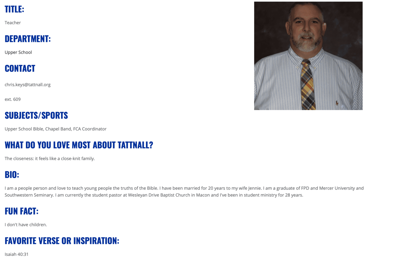 Keys recently worked as a teacher at Tattnall Square Academy, where he taught upper-school Bible, worked with the chapel band, and served as coordinator for the Fellowship of Christian Athletes, according to his now-deleted bio (above).