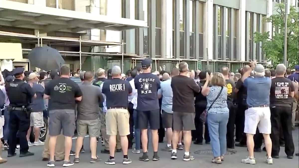 The crowd outside, which appeared to be made up of fellow cops and first responders, cheered the two criminals.