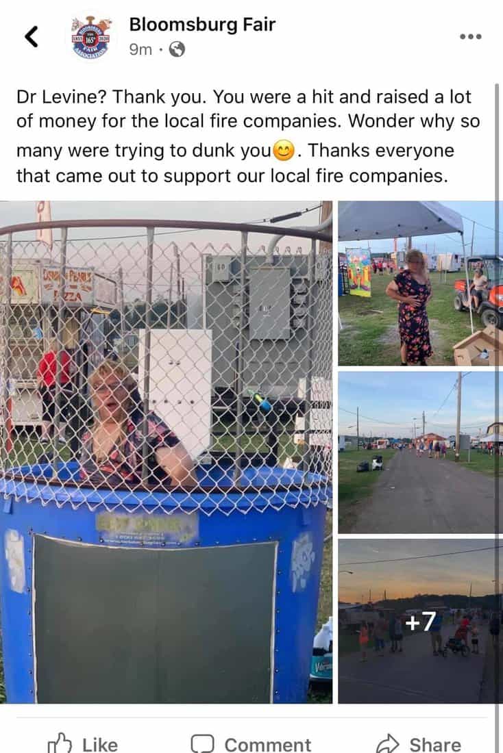 Said the text on the post accompanied by photos of a drenched man in a dress: “Dr. Levine? Thank you you were a hit and raised a lot of money for local fire companies. Wonder why so many were trying to dunk you. Thanks everyone that came out to support our local fire companies.”