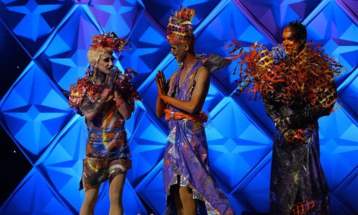 The judges save most of their vitriol for the paper team. Initially, Ilona and Tynomi had an idea for “sherbert showgirls” which sounds both delightful and maybe sticky. Their plan went off the rails when Jimbo went rogue. Jimbo had a vision as herself as a queen, and the other two blindly followed suit, redrafting their outfits in the style of fantastical knights.