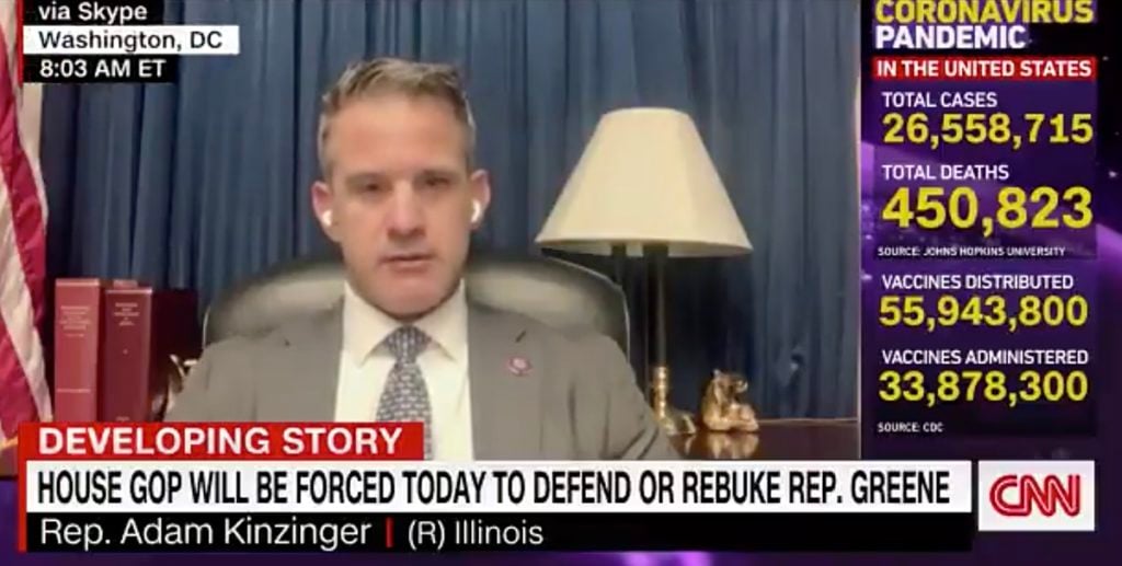Kinzinger said he would vote today to remove Greene from committee assignments: “The only thing that could change is if today she comes out and publicly shows that she has moved on, contriteness. That takes eating a lot of humble pie and it's probably going to hurt her fundraising base, so I'm not sure that's going to happen because I think a lot of this kind of boisterousness on her part is to get a bunch of Twitter followers and to raise a bunch of money. If she does that publicly today, you know, then I reserve the right to vote against the resolution on the floor. Otherwise, I do intend to vote to remove her from her from her committees, and I think it should have been done by the Republicans.”