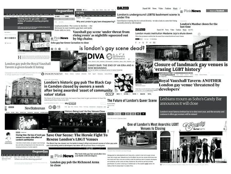 From the mid-2000s there was marked decline in the number of LGBTQ+ venues in the UK, often driven by rising rents due to urban regeneration. In London, for example, much-loved spaces like First Out, Candy Bar, and Glass Bar closed their doors. By 2015, concern about closures was so great it was reported in the mainstream press, and numerous campaigns sprang up to keep venues open. In response, my colleague Ben Campkin and I began researching LGBTQ+ nightlife in London, and found that the number of venues fell by 58% from 121 to 51 between 2006 and 2017.