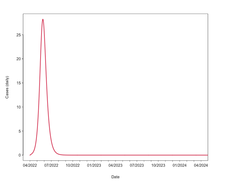 In this scenario, the outbreak ends quickly once the population at risk becomes immune and herd immunity is reached locally. In the past, many people had some immunity (called “cross-immunity”) from the smallpox mass vaccination programmes of the late 20th century. So the effective reproduction number, R, can be close to or even lower than one, and the transmission will soon stop.