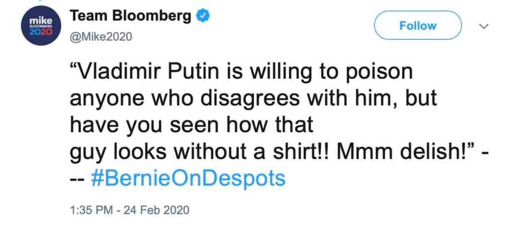 The Bloomberg campaign came under fire on Monday for a series of tweets containing fabricated hypothetical quotes from Bernie Sanders that professed his affection for various dictators. The series of tweets, since deleted, came after Sanders made headlines for praising Cuban dictator Fidel Castro's literacy program.